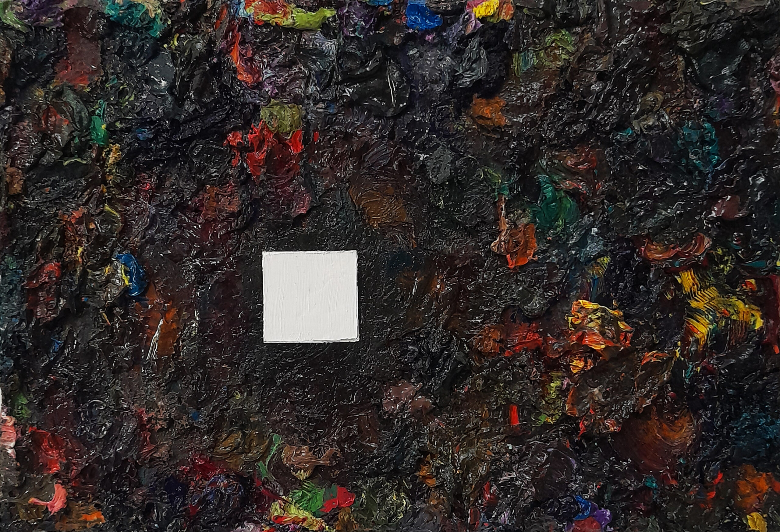 The support of the painting, used as a palette for the pictorial process, with its mixtures of color, exuberant, diverse and textured, permeated by the experience of a promiscuous and deliberate confluence of pigments, quasi space of freedom, has been unexpectedly interrupted by a supposedly perfect square, proud of its symmetry and purity of color. This work reflects on visual and cultural interference.