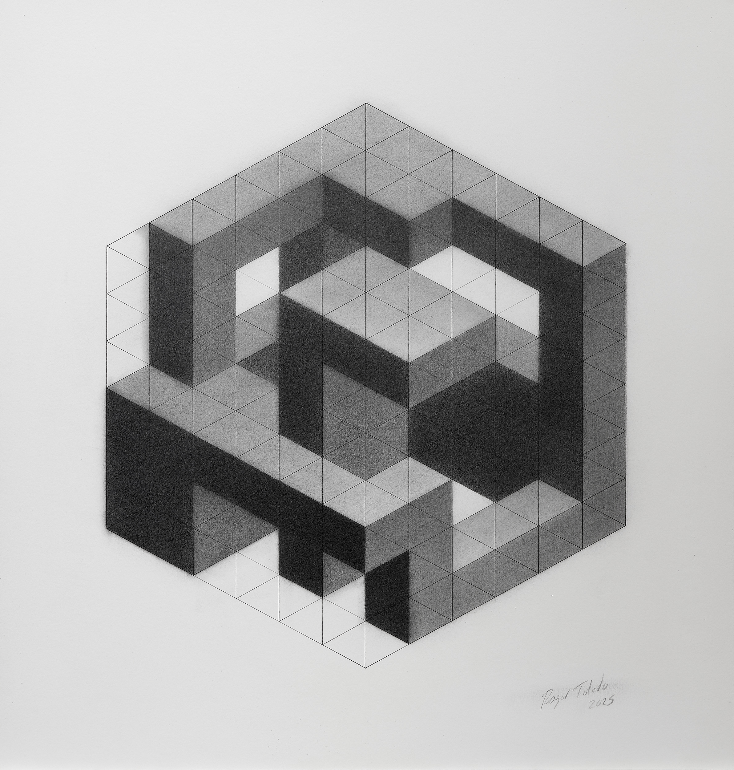 In this work, geometry functions as a device that places vision under tension. From an apparently rational structure, a form emerges that never fully settles: it advances, recedes, opens itself, and negates itself at once. The dark planes, transparencies, and internal voids produce an unstable reading of space, so the piece does not offer a single visual solution, but rather a field of perceptual possibilities. What matters here is precisely that point at which form ceases to be certainty and becomes a question.